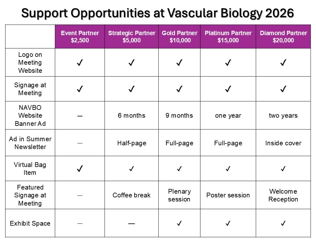 Vascular Biology 2026 will feature several themes relevant to the vascular biology community: development, genetics, inflammation, matrix biology and bioengineering, mechanotransduction, microcirculation, and vascular malformations. This is your opportunity to reach scientists in a variety of disciplines: cell biology, bioengineering, signal transduction, developmental biology, matrix biology, physiology, cardiology, pathology, molecular biology, to name a few, and gain added visibility for your organization by choosing from our wide array of support opportunities.